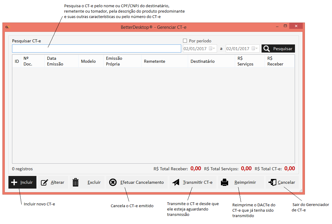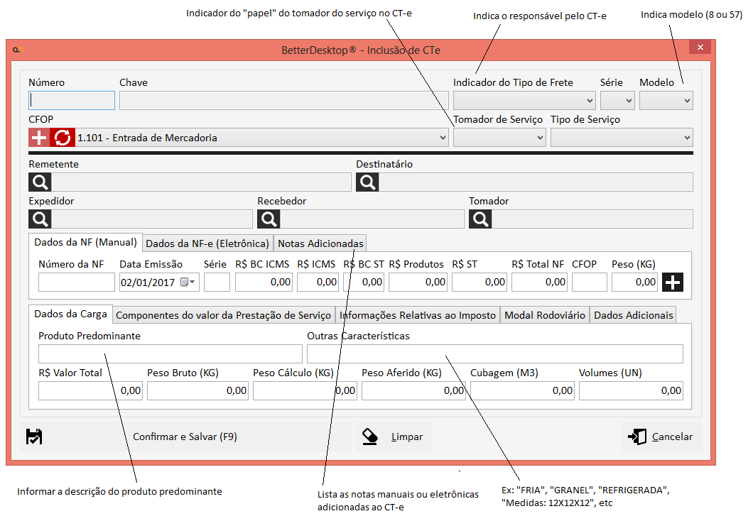 O lançamento de Conhecimento de Transporte recebido e emitido são feitos na mesma tela, tanto para modelo 8 quanto para modelo 57.