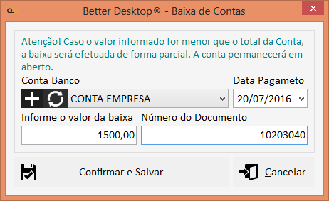 Lembrando que a conta apresentada para baixa sempre será aquela que anteriormente foi informada no lançamento da conta.