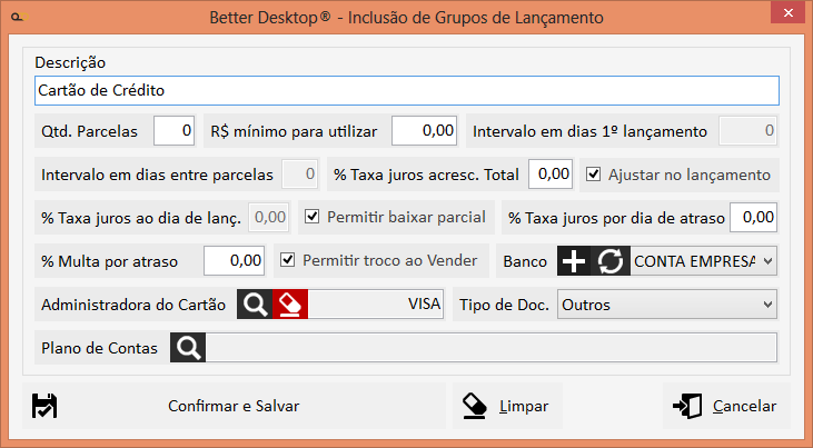 O campo Administradora do Cartão deverá ser utilizado quando a forma for uma operadora de cartão, esta opção se faz necessária para informação do Registro 1600 do Sped Fiscal, onde as operações com