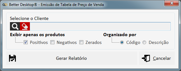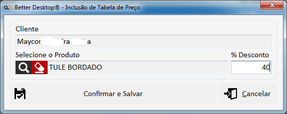Após isso será solicitado que você informe para qual cliente deseja criar a tabela, após isso será aberto a tela mostrando os produtos que este cliente