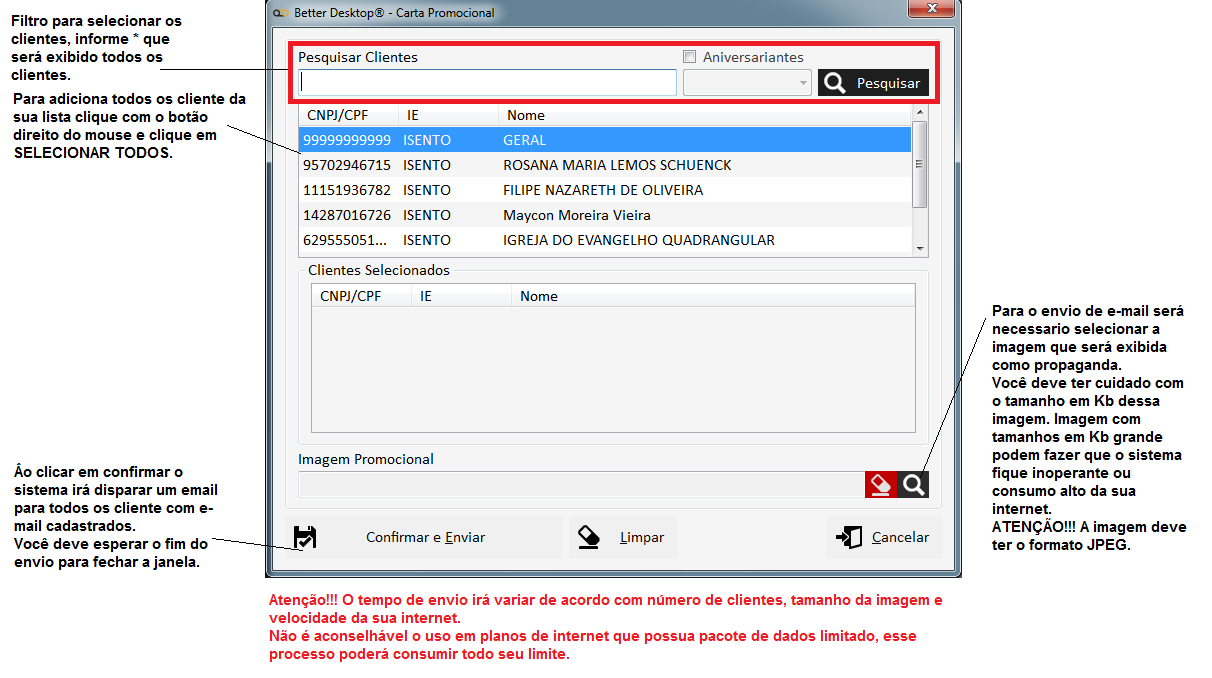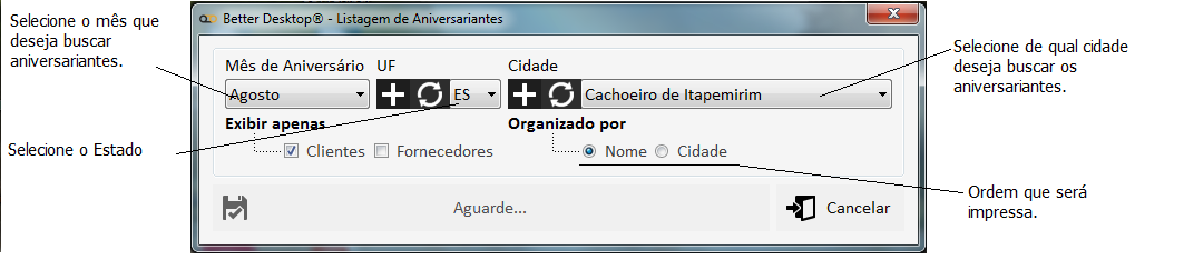 Segue o mesmo critério de carta promocional, bastando selecionar o combo [ ] Aniversariantes e escolher o mês desejado.
